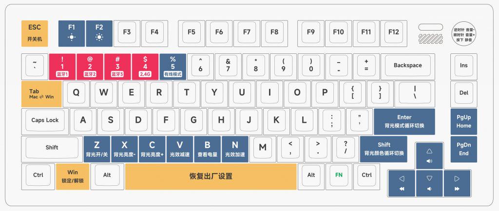 方式一:使用数据线将键盘连接到您的电脑,键盘将自动激活并进入有线模式。 方式二:长按 FN + ESC 组合键5秒,键盘将自动激活并进入2.4G无线模式。 键盘通过组合键开机,键盘将记忆关机前的连接模式。 键盘关机状态下,有线连接键盘,键盘开机并默认为有线模式。 *有线频道下指示灯颜色为:白色